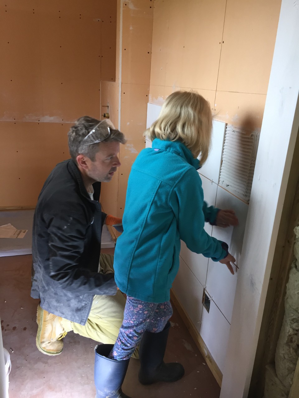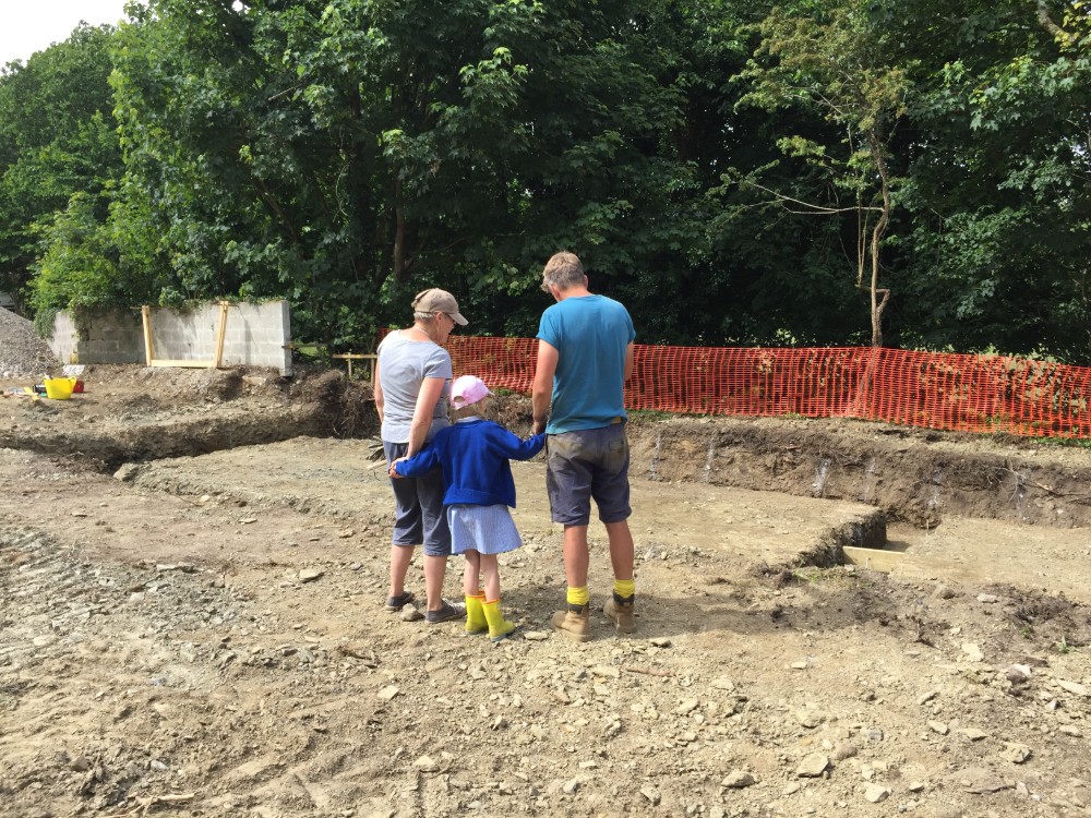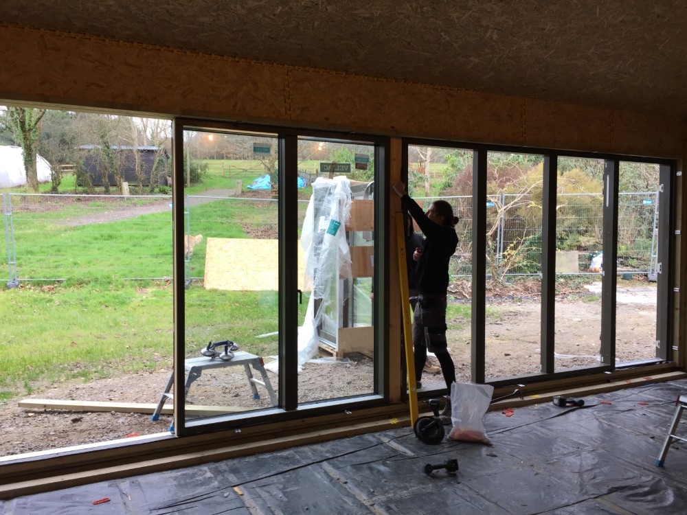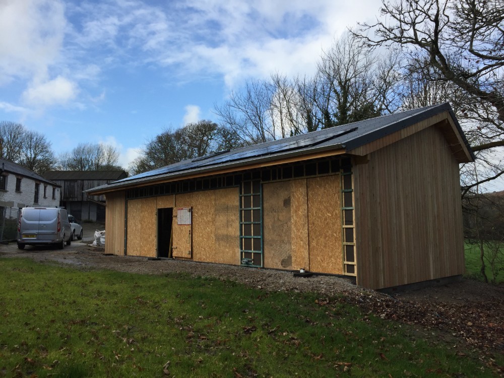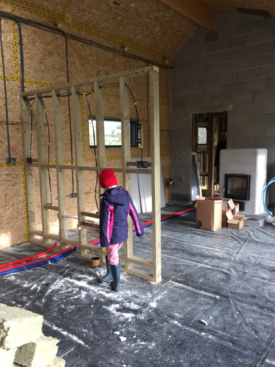 The old milking parlorBen taking the old milking parlor downDemolition day!We’re lucky to have family with some serious tools!A big empty space where the milking parlor once stoodFoundations beginThe first wallScaffold goes up. Roof beginsMetal roof goes on and larch cladding beginsBales of sheep wool arrive for the insulation. Our local farmer lends a hand unloading Solar panels are installedScaffold comes down at lastView from the rearTripple glazed windows are installedCornish china clay stove being built on siteThe stove complete, except flueInterior walls, pipes and electrical cables start to go in now the house is water tightTo do lists on the timber frames soon to be covered over with boards and insulationThe exterior before the paving and rain water drains go inThe board that will be the wall finish starts to go up in the kitchen areaPaving and rain water drains completedWork starts in the kitchenKitchen completed with green acrylic splash backsHelping dad tile the bathroomBathroom completeLED strips in the ceiling recess Painting, painting and more painting!May 2019 and a few weeks away from completion, putting us only 6 weeks past our estimated completion date