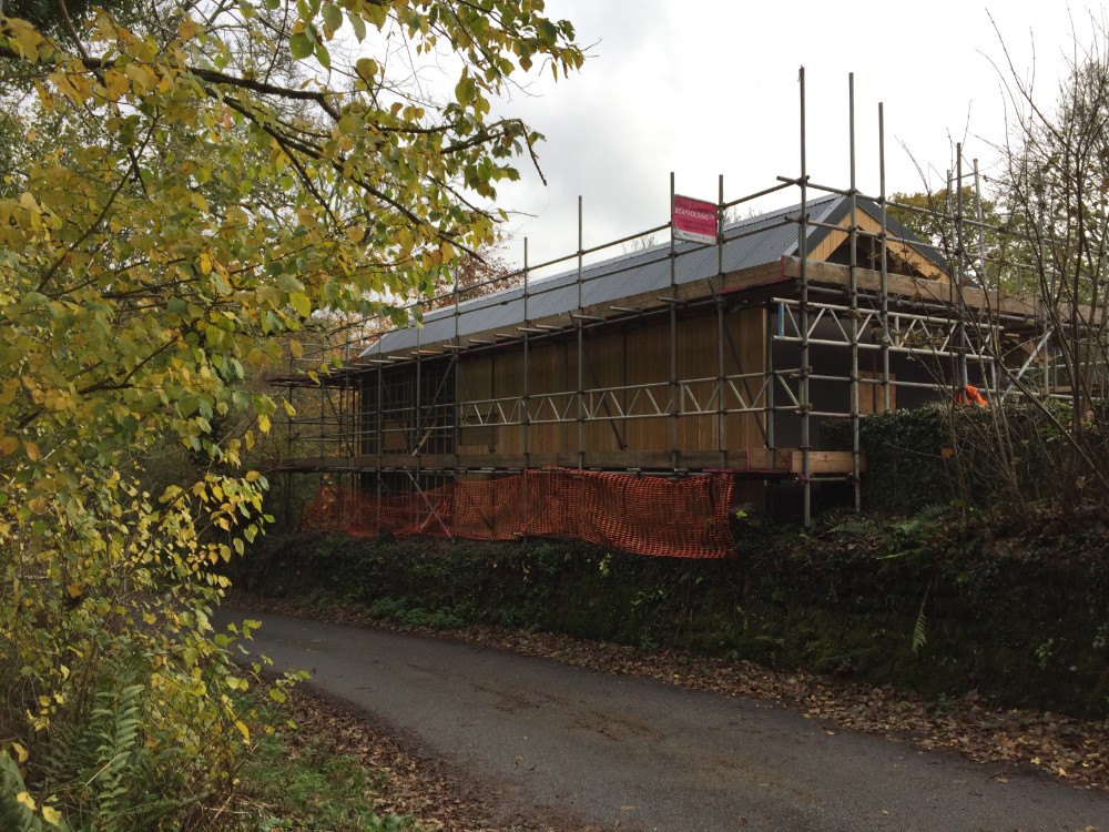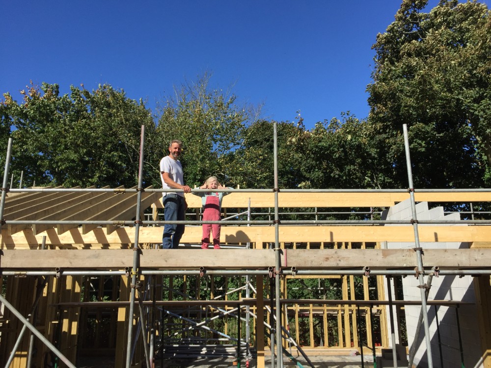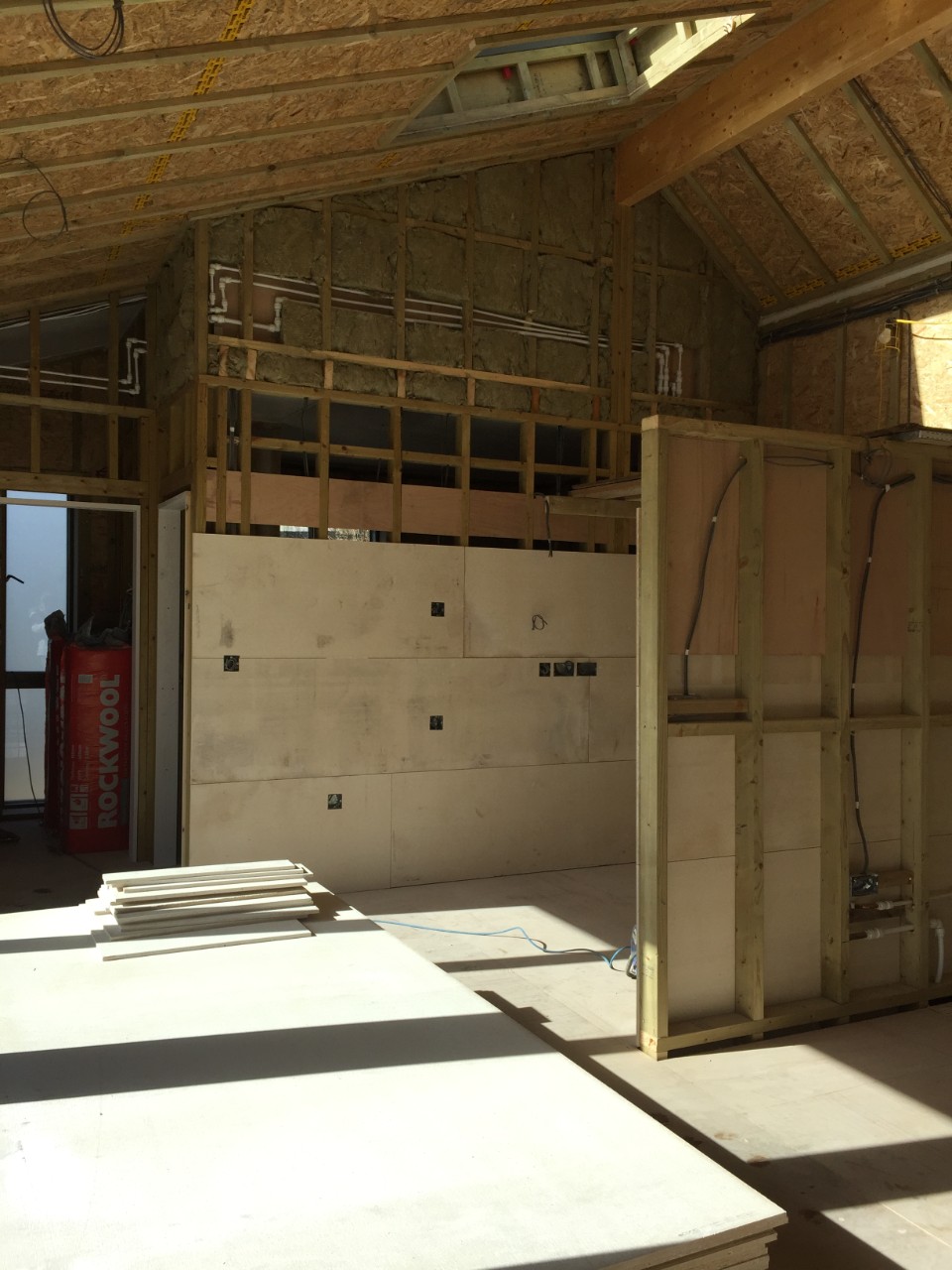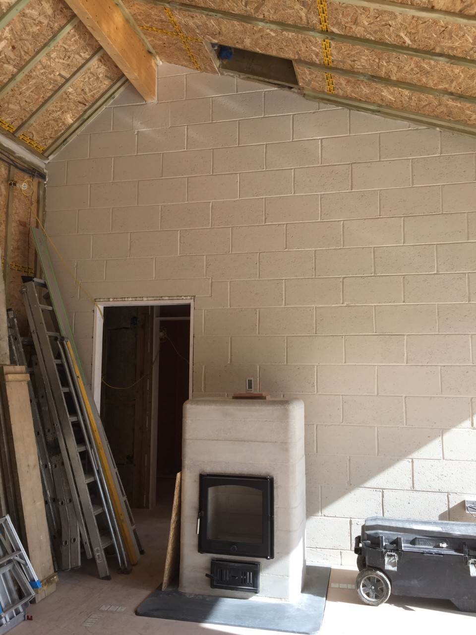 The old milking parlorBen taking the old milking parlor downDemolition day!We’re lucky to have family with some serious tools!A big empty space where the milking parlor once stoodFoundations beginThe first wallScaffold goes up. Roof beginsMetal roof goes on and larch cladding beginsBales of sheep wool arrive for the insulation. Our local farmer lends a hand unloading Solar panels are installedScaffold comes down at lastView from the rearTripple glazed windows are installedCornish china clay stove being built on siteThe stove complete, except flueInterior walls, pipes and electrical cables start to go in now the house is water tightTo do lists on the timber frames soon to be covered over with boards and insulationThe exterior before the paving and rain water drains go inThe board that will be the wall finish starts to go up in the kitchen areaPaving and rain water drains completedWork starts in the kitchenKitchen completed with green acrylic splash backsHelping dad tile the bathroomBathroom completeLED strips in the ceiling recess Painting, painting and more painting!May 2019 and a few weeks away from completion, putting us only 6 weeks past our estimated completion date