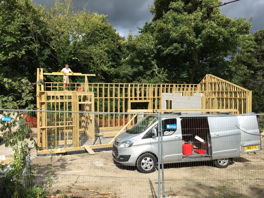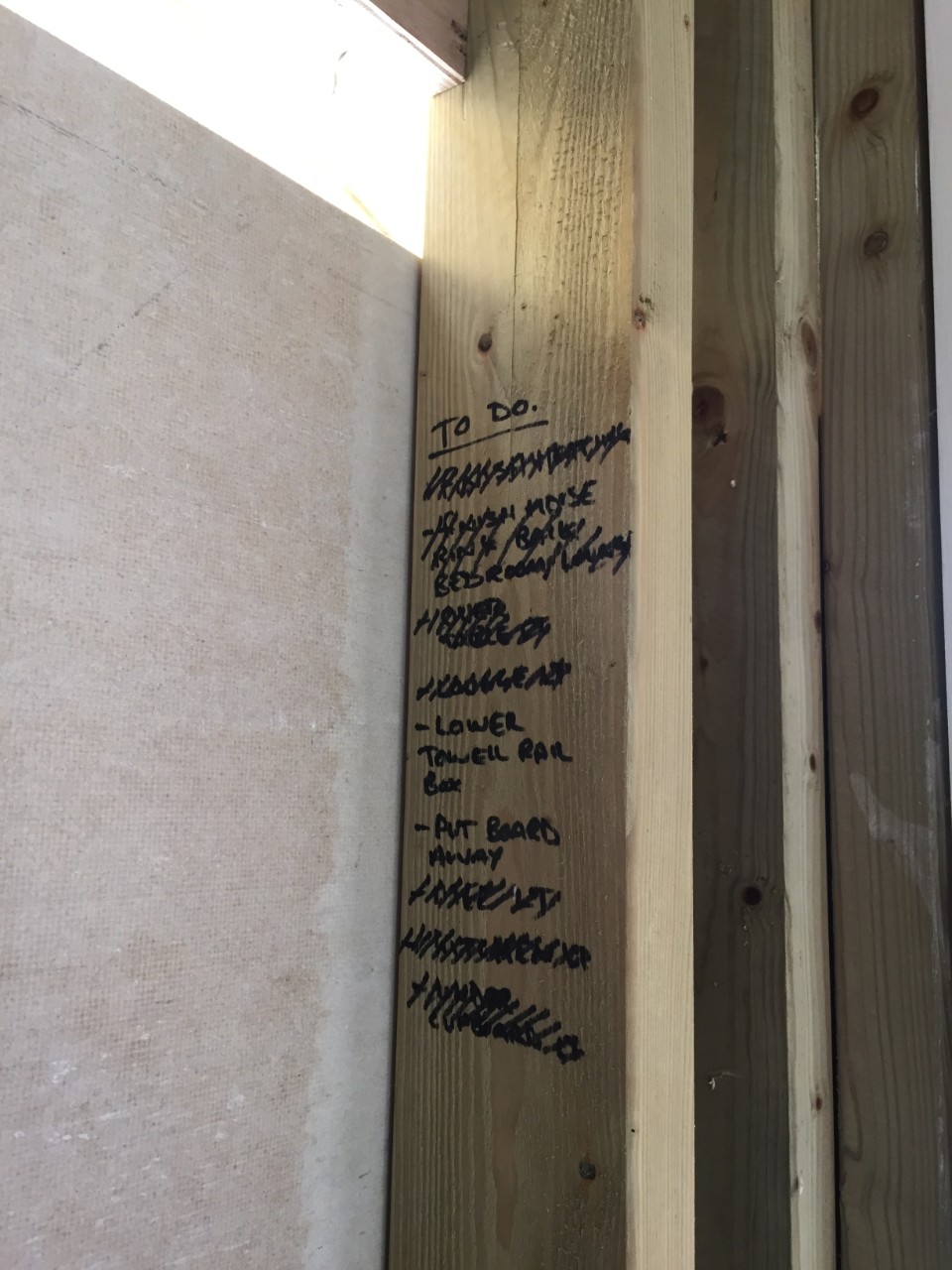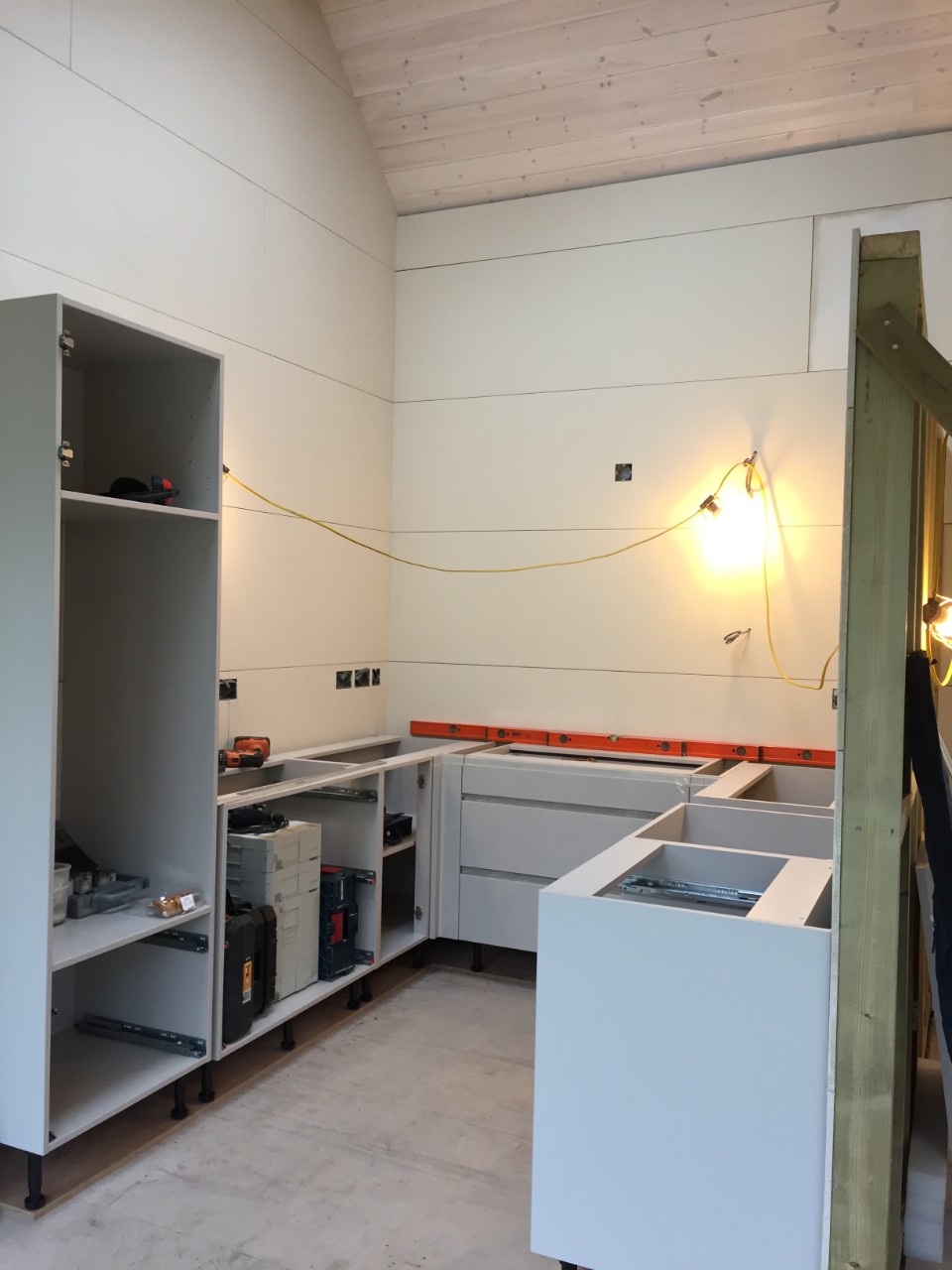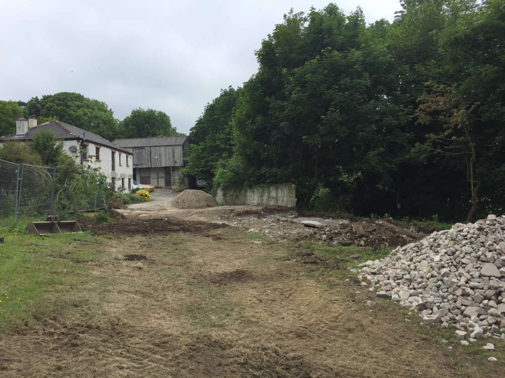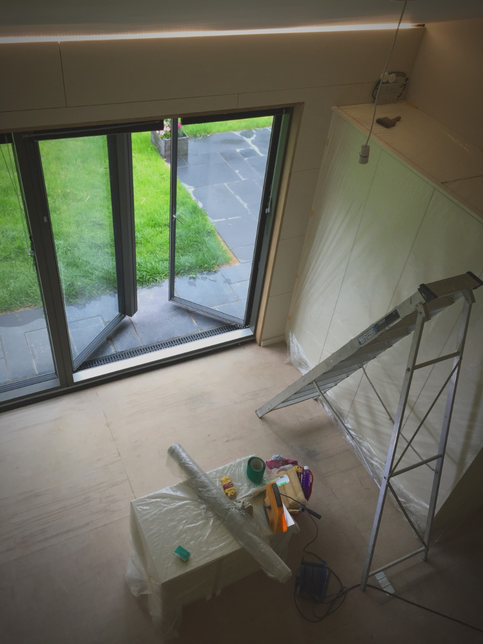 The old milking parlorBen taking the old milking parlor downDemolition day!We’re lucky to have family with some serious tools!A big empty space where the milking parlor once stoodFoundations beginThe first wallScaffold goes up. Roof beginsMetal roof goes on and larch cladding beginsBales of sheep wool arrive for the insulation. Our local farmer lends a hand unloading Solar panels are installedScaffold comes down at lastView from the rearTripple glazed windows are installedCornish china clay stove being built on siteThe stove complete, except flueInterior walls, pipes and electrical cables start to go in now the house is water tightTo do lists on the timber frames soon to be covered over with boards and insulationThe exterior before the paving and rain water drains go inThe board that will be the wall finish starts to go up in the kitchen areaPaving and rain water drains completedWork starts in the kitchenKitchen completed with green acrylic splash backsHelping dad tile the bathroomBathroom completeLED strips in the ceiling recess Painting, painting and more painting!May 2019 and a few weeks away from completion, putting us only 6 weeks past our estimated completion date
